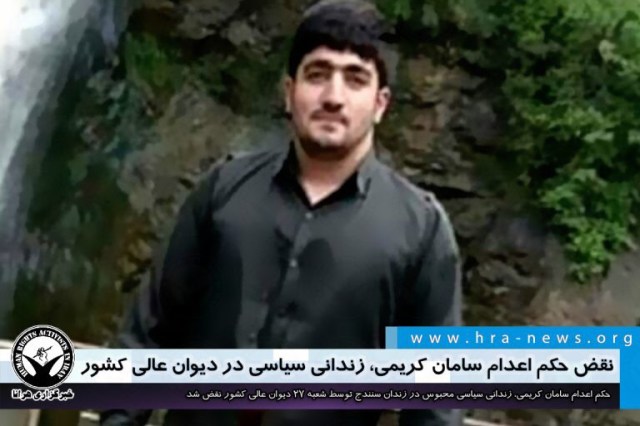 حکم اعدام سامان کریمی، زندانی سیاسی محبوس در زندان سنندج طی هفته گذشته توسط شعبه ۲۷ دیوان عالی کشور نقض شد. آقای کریمی آذرماه سال گذشته توسط دادگاه انقلاب سنندج به اعدام و ۱۱ سال حبس تعزیری محکوم شد و با گذشت حدود ۹ ماه از زمان بازداشت کماکان به صورت بلاتکلیف در زندان بسر میبرد.
