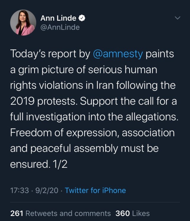 آن لینده، وزیر خارجه سوئد، در واکنش به انتشار گزارش سازمان عفو بینالملل درباره شکنجه جسمی و آزار جنسی بازداشتشدگان اعتراضات سراسری آبان ۱۳۹۸، آن را ارائهکننده «تصویری ترسناک» از نقض حقوق بشر در ایران خواند.
