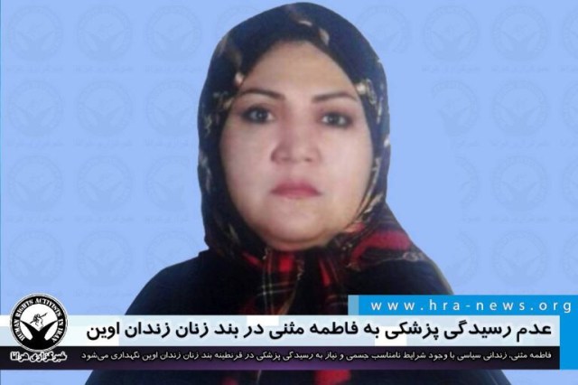 ارگان خبری مجموعه فعالان حقوق بشر در ایران، فاطمه مثنی، زندانی سیاسی با وجود شرایط نامناسب جسمی و نیاز به رسیدگی پزشکی در قرنطینه بند زنان زندان اوین نگهداری میشود.