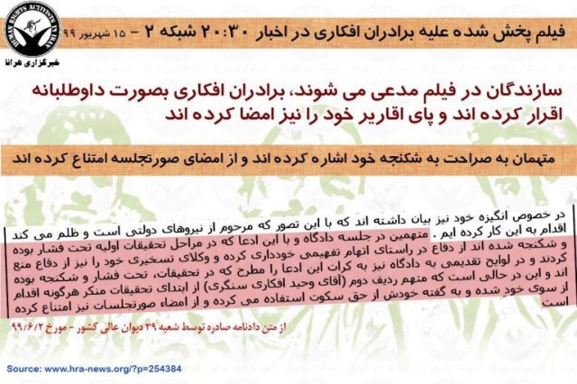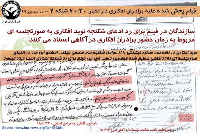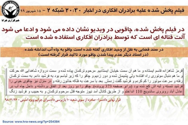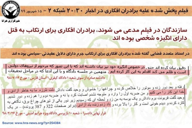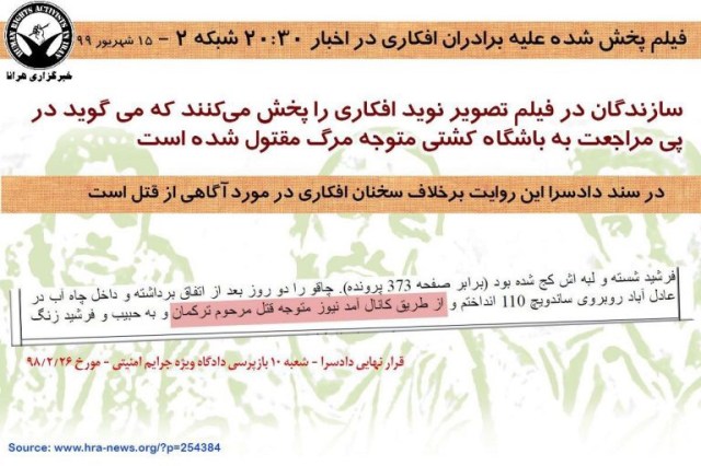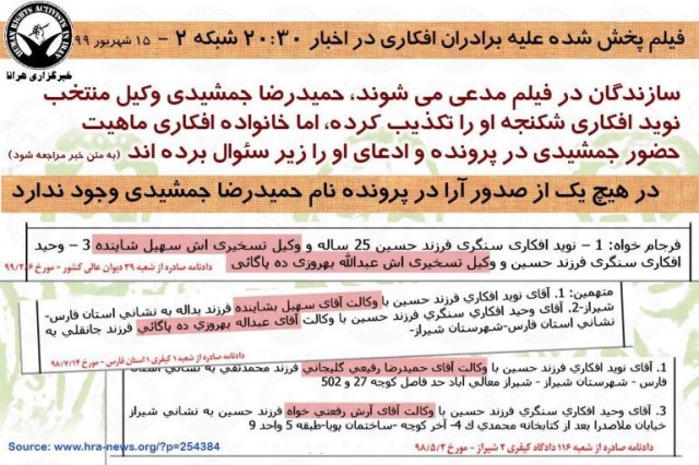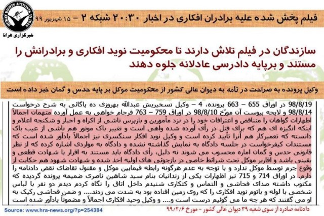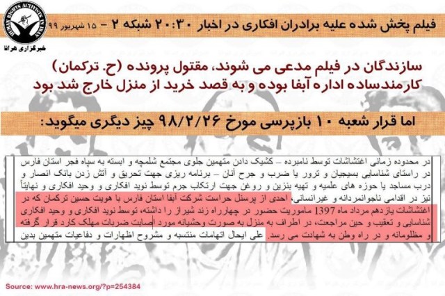 روز شنبه، هرانا از انتقال نوید افکاری، زندانی سیاسی محکوم به اعدام و دو برادر او به بندهای بسته یا امنیتی زندان عادل آباد شیراز خبر داد. در گزارش مورد اشاره هرانا پیش بینی کرده بود که در واکنش به موج گسترده حمایت های مردمی از این زندانیان، صدا و سیما قصد پخش فیلمی علیه آنان را دارد. انتقال این زندانیان مسلما باعث قطع ارتباط آنها و سلب امکان واکنش آنان به ادعاهای مطروحه در این فیلم می شود. در سایه قطع ارتباط برادران افکاری با دنیای بیرون، هرانا با بررسی تطبیقی اسنادی که از پرونده در اختیار دارد با ادعاهای مطروحه در فیلم پخش شده از شبکه دو به بررسی تعدادی از تناقضات آن به هدف تنویر افکار عمومی پرداخته است که در ادامه می آید.