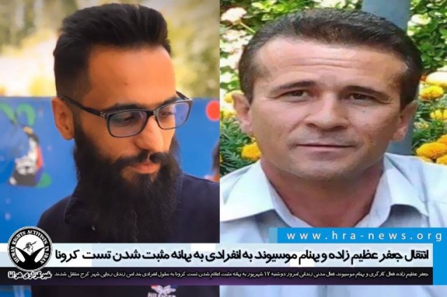 ارگان خبری مجموعه فعالان حقوق بشر در ایران، امروز دوشنبه ۱۷ شهریورماه ۱۳۹۹، جعفر عظیم زاده، فعال کارگری و بهنام موسیوند، فعال مدنی زندانی به بهانه مثبت اعلام شدن تست کرونا به سلولهای انفرادی بند امن زندان رجایی شهر کرج منتقل شدند.