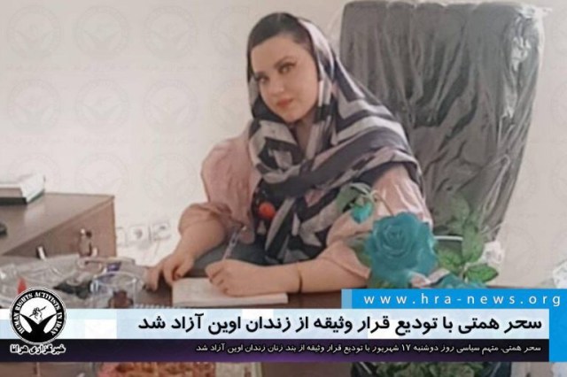 ارگان خبری مجموعه فعالان حقوق بشر در ایران، امروز دوشنبه ۱۷ شهریورماه ۱۳۹۹، سحر همتی، متهم سیاسی با تودیع قرار وثیقه به صورت موقت و تا پایان مراحل دادرسی از بند زنان زندان اوین آزاد شد.