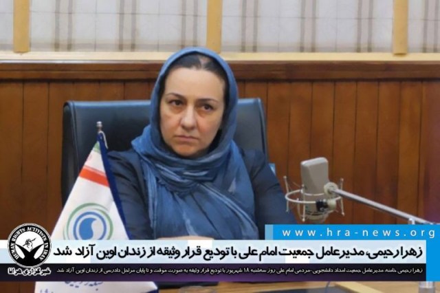 ارگان خبری مجموعه فعالان حقوق بشر در ایران، امروز سهشنبه ۱۸ شهریورماه ۱۳۹۹، زهرا رحیمی خامنه، مدیرعامل جمعیت امداد دانشجویی-مردمی امام علی از زندان اوین آزاد شد.