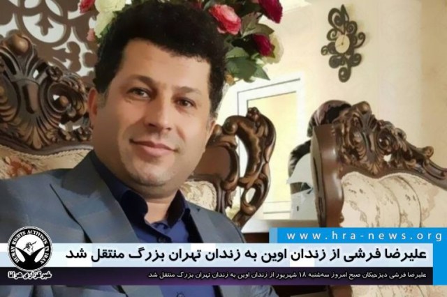 ارگان خبری مجموعه فعالان حقوق بشر در ایران، ساعت ۱۰ صبح امروز سهشنبه ۱۸ شهریورماه ۱۳۹۹، علیرضا فرشی دیزجیکان، فعال ترک (آذربایجانی) از بند ۸ زندان اوین به بند ۱ تیپ ۵ زندان تهران بزرگ منتقل شد.