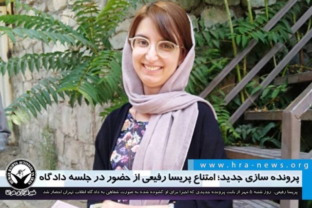 ارگان خبری مجموعه فعالان حقوق بشر در ایران، امروز شنبه ۵ مهرماه ۱۳۹۹، پریسا رفیعی، فعال صنفی دانشگاه تهران محبوس در زندان اوین از بابت پرونده جدیدی که اخیرا برای او گشوده شده دادگاه انقلاب تهران احضار شد.