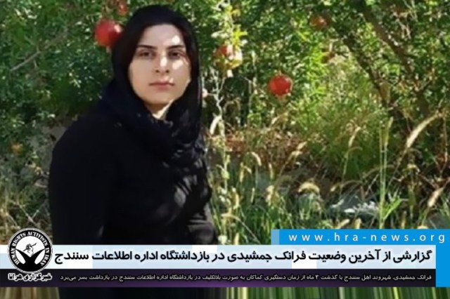 ارگان خبری مجموعه فعالان حقوق بشر در ایران، فرانک جمشیدی، شهروند اهل سنندج با گذشت حدود ۳ ماه از زمان بازداشت کماکان به صورت بلاتکلیف در بازداشتگاه اداره اطلاعات سنندج در بازداشت بسر میبرد.