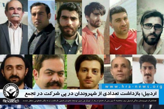 تعدادی از شهروندان ساکن اردبیل امروز سهشنبه ۸ مهر پس از تجمع در پارک جیرال این شهر توسط ماموران امنیتی بازداشت و به مکان نامعلومی منتقل شدند. تاکنون هویت یازده تن از شهروندان با اسامی عسگر اکبرزاده، مجتبی پروین، مرتضی پروین، مصطفی پروین، مهدی هوشمند، محمد جولانی، پرویز سیابی، سجاد جولانی، حسین بالاخانی، بهمن خیرجو، حامد حیدری باریس احراز شده است. تجمع این شهروندان در پی فراخوان قبلی و در واکنش به تحولات منطقه صورت گرفته بود.