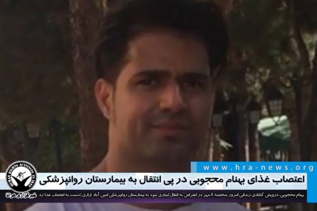 بهنام محجوبی، درویش گنابادی زندانی امروز سهشنبه ۸ مهر در اعتراض به انتقال اجباری خود به بیمارستان روانپزشکی امین آباد (رازی) دست به اعتصاب غذا زد. آقای محجوبی روز یکشنبه ۶ مهرماه به صورت اجباری به این بیمارستان منتقل شد.