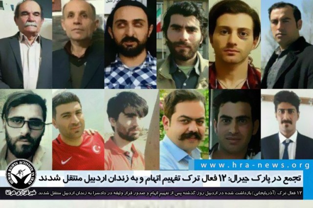 عسگر اکبرزاده، مهدی هوشمند، سجاد جولانی، حسین بالاخانی، مجتبی پروین، مصطفی پروین، محمد جولانی، حامد حیدری باریس، بهمن خیرجو، پرویز سیابی، مرتضی پروین و سبحان بخشی، ۱۲ فعال ترک (آذربایجانی) بازداشت شده در اردبیل روز گذشته پس از تفهیم اتهام و صدور قرار وثیقه در دادسرا به زندان اردبیل منتقل شدند. این شهروندان روز سهشنبه ۸ مهر پس از تجمع در پارک جیرال این شهر توسط ماموران امنیتی بازداشت و به مکان نامعلومی منتقل شدند. تجمع این شهروندان در پی فراخوان قبلی و در واکنش به تحولات منطقه صورت گرفته بود.