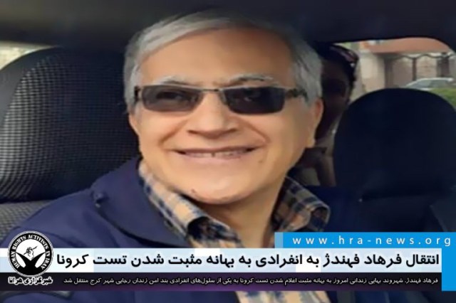 ارگان خبری مجموعه فعالان حقوق بشر در ایران، امروز پنجشنبه ۱۰ مهرماه ۱۳۹۹، فرهاد فهندژ، شهروند بهایی زندانی در فرعی سالن امنیتی ۱۰ بند ۴ زندان رجایی شهر کرج به بهانه مثبت اعلام شدن تست کرونا به یکی از سلولهای انفرادی بند امن این زندان منتقل شد.