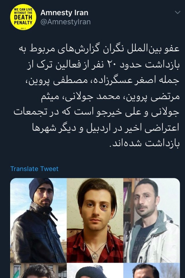 سازمان عفو بینالملل نسبت به بازداشت حدود ۲۰ نفر از فعالان ترک در تجمعات اعتراضی اخیر در اردبیل و شهرهای دیگر ابراز نگرانی کرد.