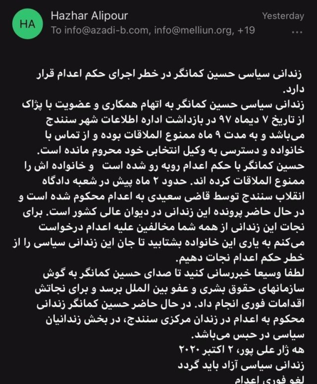 ایمیل دریافتی از هژار علیپور