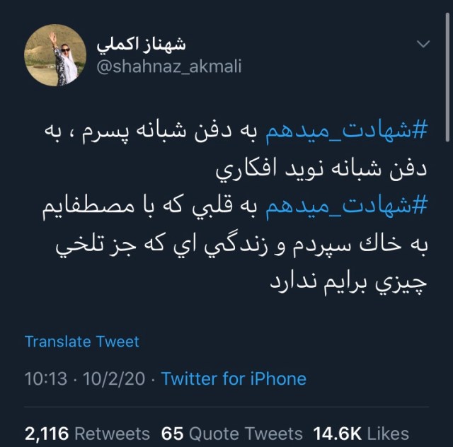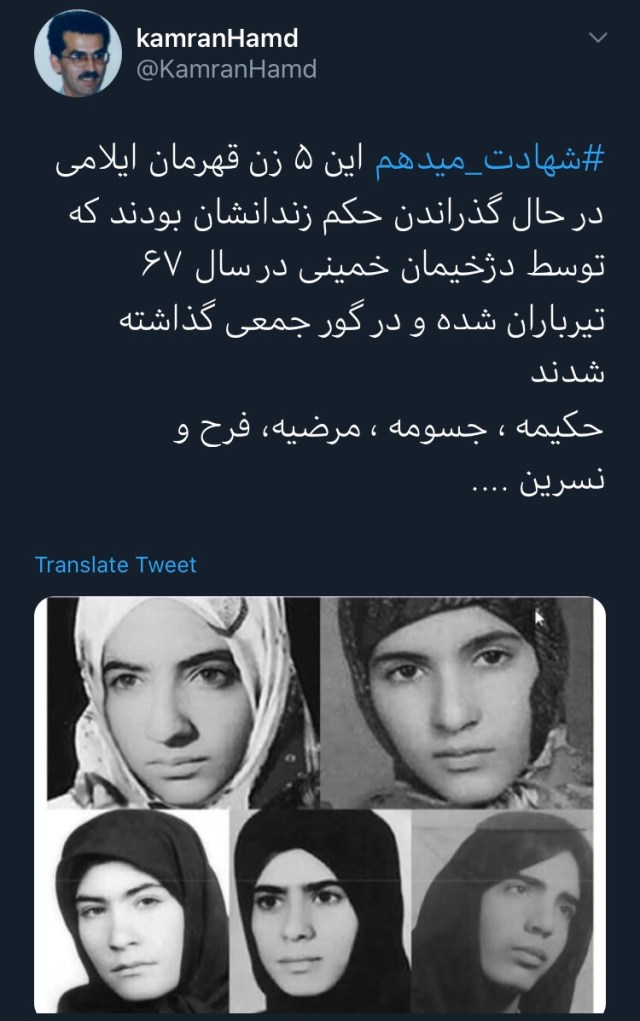 کاربری به نام «امینه» در زمینه اعدامهای دهه اول استقرار جمهوری اسلامی نوشت: «شهادت میدهم به قتلعام۶۷ ، شهادت میدهم به اینکه پدرم و تمامی دوستانش که همیشه پشت شیشههای زندان ملاقات میکردم تنها به جرم هواداری از سازمان مجاهدین خلق، علیرغم حکم چند سال زندان به خانه برنگشتند و همگی سربدار شدند و در گورهای دستهجمعی به خاک سپرده شدند…»