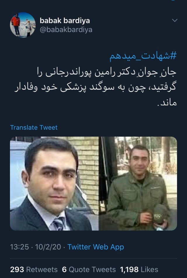 «بابک بردیا» به مرگ رامین پواندرجانی، پزشک زندان کهریزک که در آبان ۱۳۸۸ و در پی اعتراضات پس از انتخابات ریاستجمهوری کشته شد، اشاره کرد.