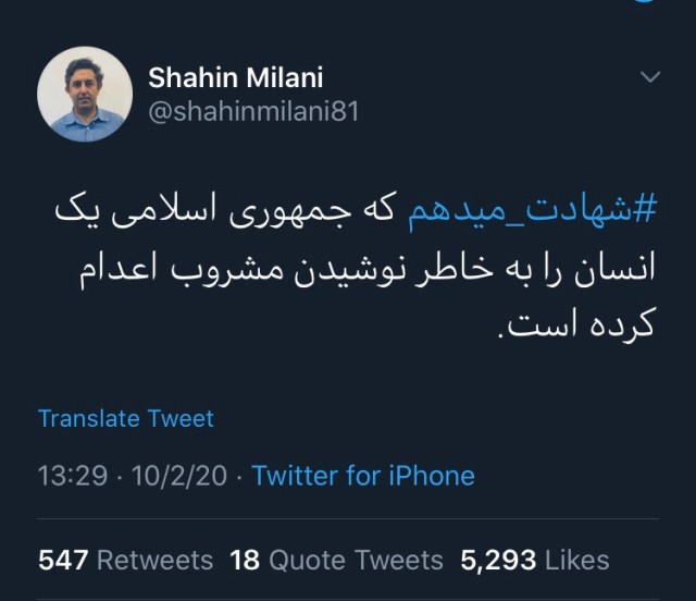 شاهین میلانی نوشته است: «شهادت میدهم که جمهوری اسلامی یک انسان را به خاطر نوشیدن شراب اعدام کرده است.» اشاره او به اعدام اخیر یک زندانی در مشهد در همین زمینه است.