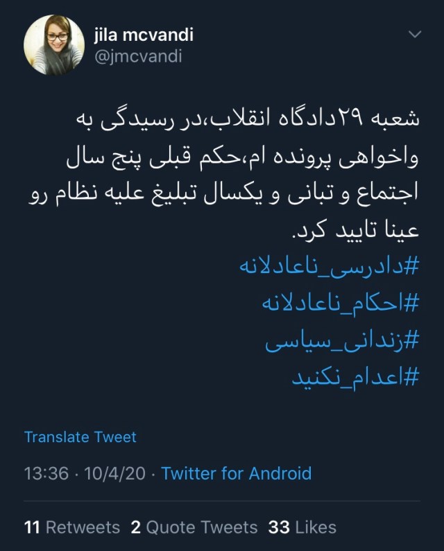 به گزارش کمپین دفاع از زندانیان سیاسی و مدنی، دادگاه انقلاب تهران طی حکمی ژیلا کرم زاده مکوندی، فعال مدنی را به شش سال زندان تعزیری محکوم کرده است.