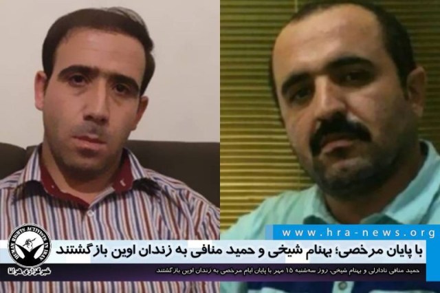 ارگان خبری مجموعه فعالان حقوق بشر در ایران، روز سهشنبه ۱۵ مهرماه ۱۳۹۹، حمید منافی نادارلی و بهنام شیخی، فعالین ترک (آذربایجانی) با پایان مرخصی به زندان اوین بازگشتند.