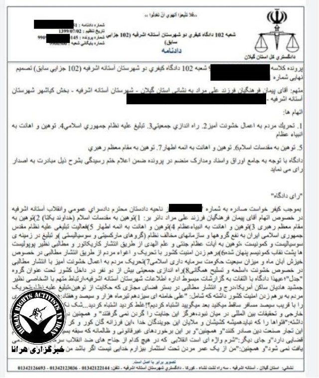 پیمان فرهنگیان، شاعر و فعال کارگری ساکن بندر کیاشهر توسط دادگاه کیفری دو شهرستان آستانه اشرفیه به صورت غیابی به ۳۸ سال حبس تعزیری و ۱ سال شرکت اجباری در کلاسهای آموزش معارف و علوم دینی محکوم شده است. دادگاه دو فقره شش ماه حبس از بابت اتهامات توهین به مسئولان نظام را به مجازات اشد با اعمال ماده ۱۳۴ قانون مجازات اسلامی، یعنی ۱۰ سال حبس تعزیری از بابت اتهام راه اندازی جمعیتی بیش از دو نفر در داخل کشور در شبکه اجتماعی سیگنال به قصد بر هم زدن امنیت کشور افزوده است، بنابراین در صورت تایید این حکم در مرحله تجدیدنظر ۱۱ سال زندان برای او قابل اجرا است.