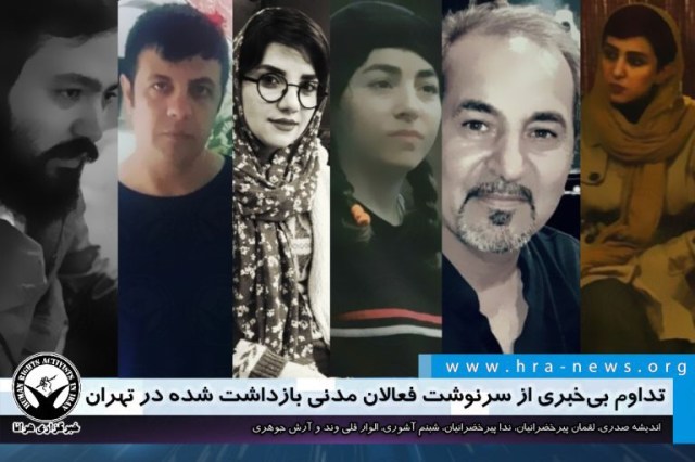 ارگان خبری مجموعه فعالان حقوق بشر در ایران، با گذشت ۶ روز از بازداشت شبنم آشوری، الوار قلی وند، ندا پیرخضرانیان، آرش جوهری و اندیشه صدری، فعالین مدنی در تهران خانواده آنان در بی خبری بسر میبرند.