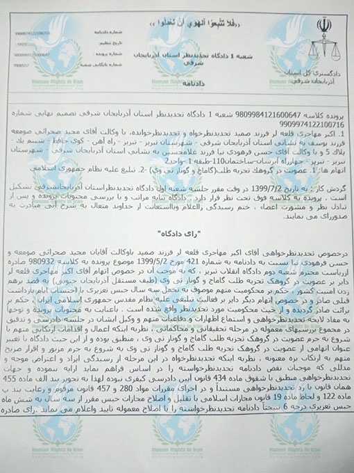 امروز یکشنبه ۲۰ مهر ماه ۱۳۹۹، شعبه ۱ دادگاه تجدیدنظر استان آذربایجان شرقی با صدور دادنامه ای، اکبر مهاجری، فعال ملی مدنی را به حبس تعزیری محکوم کرد.