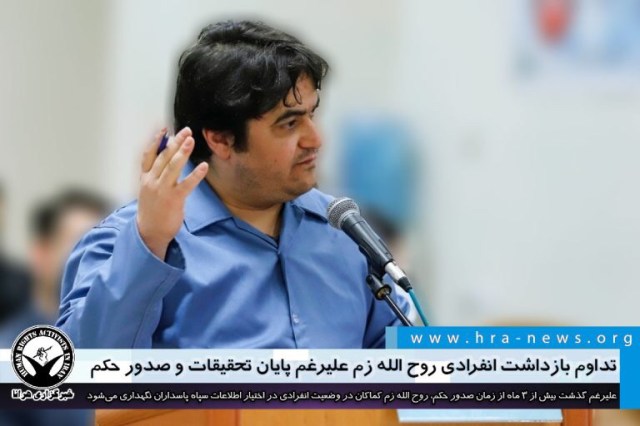 روح الله زم، زندانی سیاسی محکوم به اعدام پس از گذشت ماهها از زمان پایان تحقیقات پرونده و همینطور گذشت بیش از ۳ ماه از زمان صدور حکم، کماکان در وضعیت انفرادی در اختیار اطلاعات سپاه پاسداران نگهداری میشود. همچنین باوجود ارسال پرونده آقای زم به دیوان عالی کشور و ادعای رئیس دیوان مبنی بر تصمیمگیری نهائی در خصوص این پرونده، کماکان نتیجه آن اعلام نشده است.