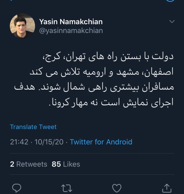 روز چهارشنبه وزارت بهداشت در راستای تشدید محدودیتهای مقابله با کرونا سفر به پنج شهر تهران، کرج، اصفهان، مشهد و ارومیه را موقتا تا ظهر یکشنبه ممنوع کرد.
