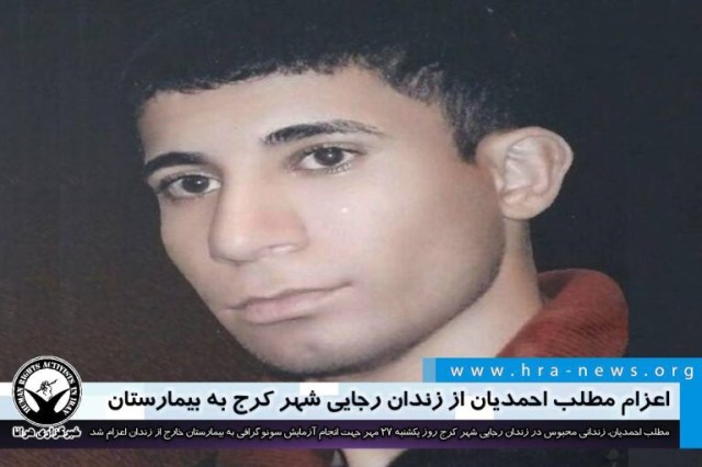 ارگان خبری مجموعه فعالان حقوق بشر در ایران، روز یکشنبه ۲۷ مهرماه ۱۳۹۹، مطلب احمدیان، زندانی محبوس در زندان رجایی شهر کرج به بیمارستان خارج از زندان اعزام شد.