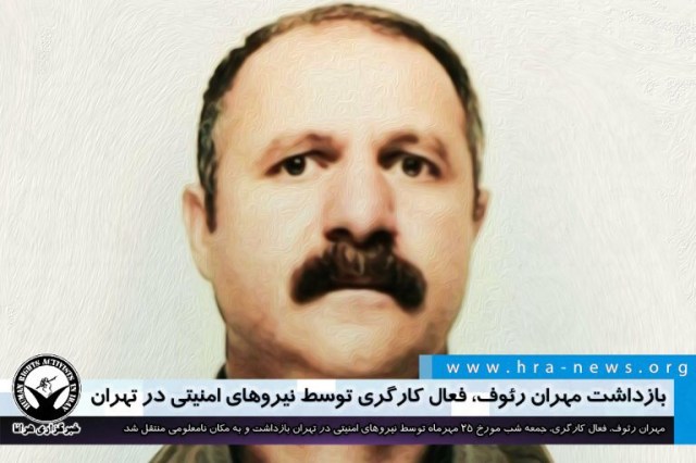 مهران رئوف، فعال کارگری، جمعه شب مورخ ۲۵ مهرماه توسط نیروهای امنیتی در تهران بازداشت و به مکان نامعلومی منتقل شد. ماموران در حین بازداشت آقای رئوف اقدام به تفتیش منزل این شهروند کرده و تعدادی از وسایل شخصی ایشان را ضبط کرده و با خود بردند.
