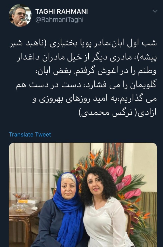 همزمان نرگس محمدی، نایبرییس کانون مدافعان حقوق بشر که به تازگی از زندان اوین آزاد شد، با مادر پویا بختیاری، جوان کشتهشده با گلوله نیروهای امنیتی در این اعتراضات، دیدار کرد.