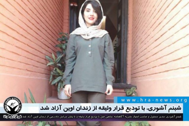ارگان خبری مجموعه فعالان حقوق بشر در ایران، امروز سهشنبه ۶ آبان ۱۳۹۹، شبنم آشوری، مدیر مسئول و صاحب امتیاز نشریه آگاهنامه با تودیع قرار وثیقه ۵۰۰ میلیون تومانی به صورت موقت و تا پایان مراحل دادرسی از زندان اوین آزاد شد.