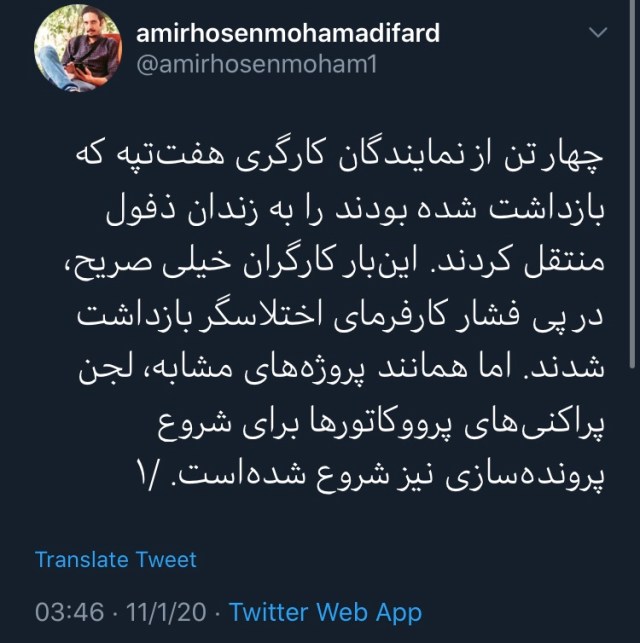روز شنبه، کانال تلگرام «سندیکای کارگران نیشکر هفتتپه» خبر داده بود که ابراهیم عباسی منجزی، مسعود حیوری، یوسف بهمنی و حمید ممبینی، چهار کارگر بازداشتی این کارخانه، پس از سه روز بازداشت در اداره پلیس آگاهی شوش، به زندان دزفول منتقل شدهاند.