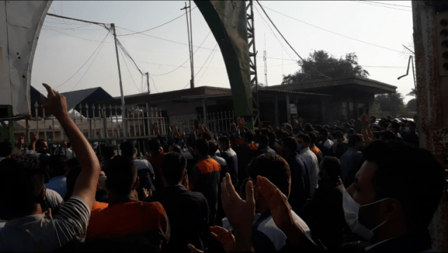 امروز جمعه ۱۶ آبان، شماری از کارگر مجتمع نیشکر هفت تپه، در اعتراض به حضور نیروی انتظامی و اخراج ۱۵ نفر کارگران، در مقابل درب ورودی این شرکت دست به تجمع اعتراضی زدند۔