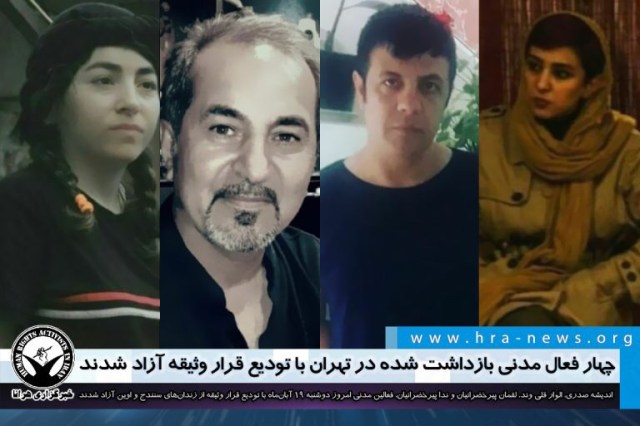 الوار قلی وند، ندا پیرخضرانیان و لقمان پیرخضرانیان، فعالین مدنی امروز دوشنبه ۱۹ آبانماه با تودیع قرار وثیقه از زندان اوین آزاد شدند. همزمان اندیشه صدری، دانش آموخته هنر نیز با تودیع قرار وثیقه از زندان سنندج آزاد شد. این شهروندان پیشتر در تاریخ ۱۵ مهرماه امسال توسط نیروهای امنیتی در تهران بازداشت و به بازداشتگاه وزارت اطلاعات موسوم به بند ۲۰۹ زندان اوین منتقل شدند. خانم صدری روز شنبه ۳ آبان از زندان اوین به بند زنان زندان سنندج منتقل شده بود.