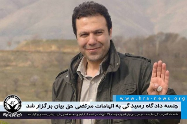 جلسه دادگاه رسیدگی به اتهامات مرتضی حق بیان، روزنامه نگار ساکن سنندج امروز دوشنبه ۲۶ آبانماه در شعبه ۱۰۴ دادگاه کیفری سنندج برگزار شد.