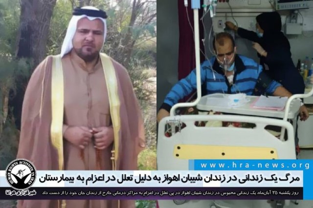 ارگان خبری مجموعه فعالان حقوق بشر در ایران، روز یکشنبه ۲۵ آبانماه ۱۳۹۹، یک زندانی محبوس در زندان شیبان اهواز به دلیل تعلل در اعزام به بیمارستان جان باخت.