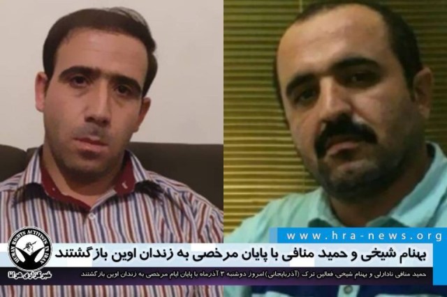حمید منافی نادارلی و بهنام شیخی، فعالین ترک (آذربایجانی) که در تاریخ ۲۳ مهرماه امسال به مرخصی اعزام شده بودند. امروز دوشنبه ۳ آذرماه جهت تحمل ادامه دوران محکومیت خود به زندان اوین بازگشتند.