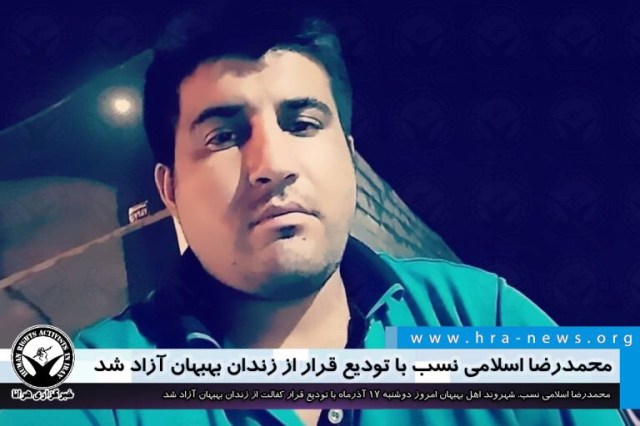 ارگان خبری مجموعه فعالان حقوق بشر در ایران، امروز دوشنبه ۱۷ آذرماه ۱۳۹۹، محمدرضا اسلامی نسب، شهروند اهل بهبهان با تودیع قرار کفالت از زندان بهبهان آزاد شد.
