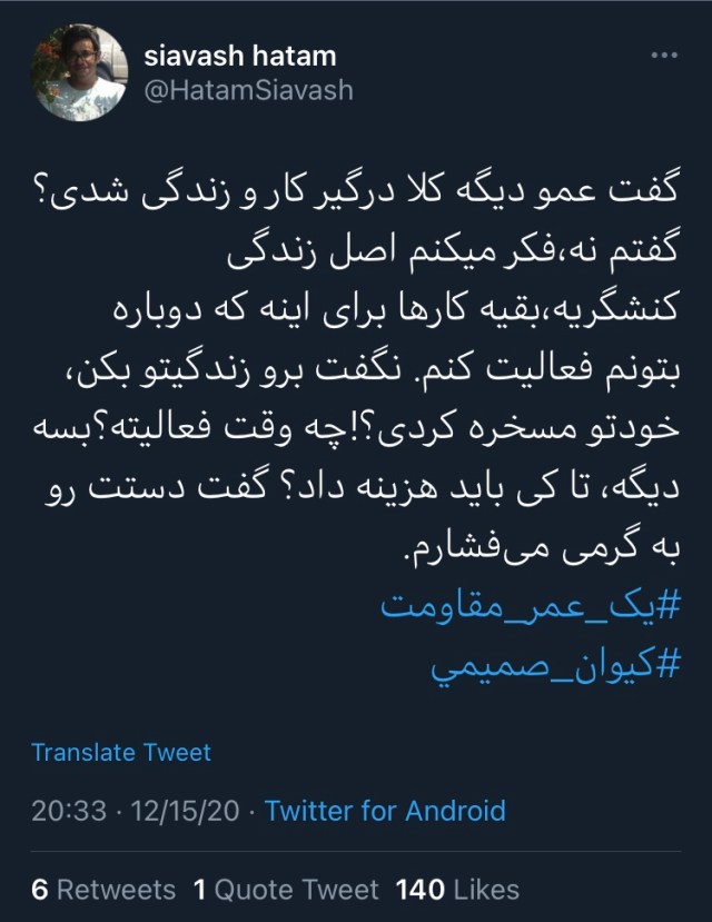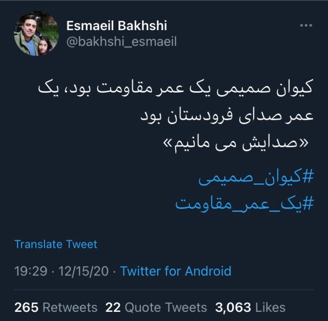 ضیا نبوی، فعال سابق دانشجویی که سابقه زندان سیاسی دارد، نیز در صفحه توییترش نوشت «آنها که کیوان صمیمی را میشناسند، خوب میدانند که یک عمر مقاومت وصف اغراقآمیزی نیست…»