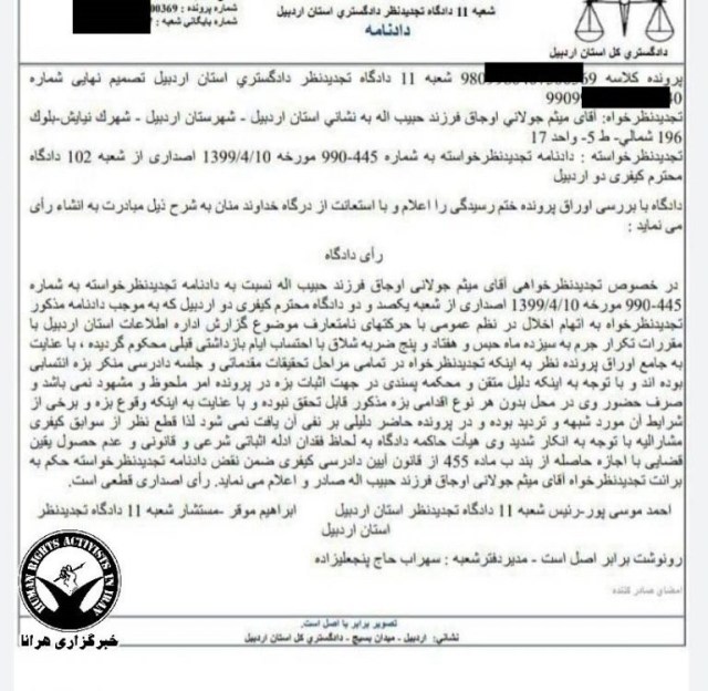 بر اساس این حکم که توسط شعبه ۱۱ دادگاه تجدیدنظر استان اردبیل به ریاست قاضی احمد موسی پور و مستشاری قاضی ابراهیم موقر صادر و ابلاغ شده است، آقای جولانی از بابت اتهام “اخلال در نظم عمومی از طریق حرکتهای نامتعارف” تبرئه شده است.
