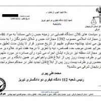 بر اساس این حکم که روز دوشنبه ۲۲ دیماه توسط شعبه ۱۱۲ دادگاه کیفری ۲ تبریز به ریاست قاضی محمدعلی پیری صادر و امروز سهشنبه ۲۳ دیماه به این افراد ابلاغ شده است، یاسمن ظفری، حکیمه احمدی، رحیم ساسانی، سعدالله ساسانی و مهدی پورعلی خرمالو هر یک از بابت اتهامات “اخلال در نظم و آسایش عمومی، اخلال در نظم عمومی از طریق شرکت در تجمعات غیرقانونی و تمرد به ماموران” به ۱ سال حبس و ۶۰ ضربه شلاق محکوم شدهاند. این محکومیت به مدت ۴ سال به حالت تعلیق درآمده است.