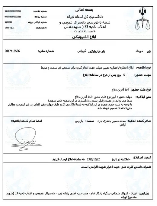 امروز پنجشنبه ۲۵ دی ماه ۱۳۹۹، شعبه ۶ بازپرسی دادسرای زندان اوین با ارسال ابلاغیه ای کتبی، مهرداد گریوانی، فعال مدنی را برای حضور در جلسه بازپرسی فراخواند.