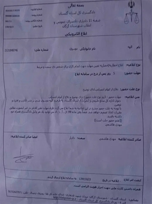 امروز دوشنبه ۲۹ دی ماه ۱۳۹۹، شعبه ۱۱ بازپرسی دادسرای عمومی و انقلاب گرگان به ریاست بازپرس مهدی هاشمی با صدور و ابلاغیه ای کتبی الهه موسوی، روزنامه نگار را برای حضور در جلسه بازپرسی و تفهیم اتهام فراخواند.