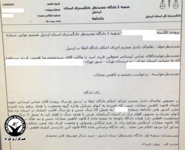 شعبه ۱ دادگاه تجدیدنظر استان اردبیل با صدور دادنامهای تقاضای دادیار اجرای احکام دادگاه انقلاب اردبیل جهت اعمال قانون کاهش مجازات حبس در پرونده عباس لسانی، فعال ترک (آذربایجانی) را رد کرد. آقای لسانی پیشتر توسط دادگاه انقلاب اردبیل به ۸ سال حبس تعزیری و دو سال تبعید محکوم شد. این حکم در مهرماه ۹۸ توسط دادگاه تجدید نظر استان اردبیل به ۱۵ سال حبس تعزیری افزایش یافت و در دیوان عالی کشور نیز تایید شده بود.