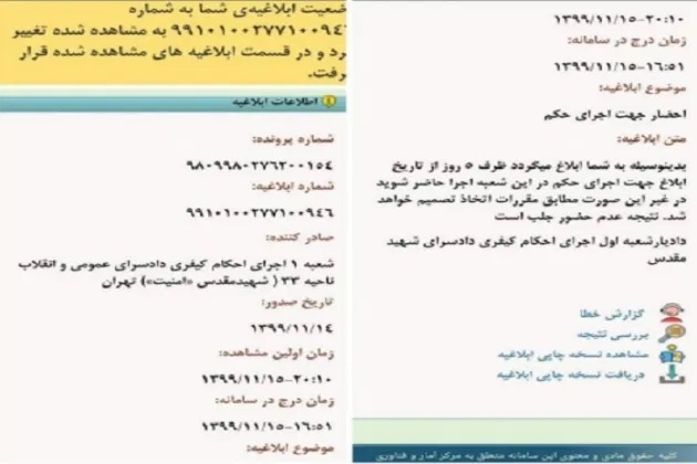 بر اساس ابلاغیه صادره، خانم راحمی پور می بایست ظرف مدت پنج روز از تاریخ ابلاغ، جهت اجرای حکم حبس به شعبه اول اجرای احکام کیفری دادسرای شهید مقدس تهران مراجعه کند.