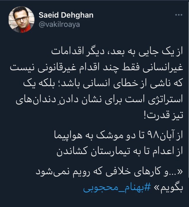 سعید دهقان، وکیل دادگستری که پرونده برخی زندانیان سیاسی را بر عهده داشته، در توییترش نوشت: «از یک جایی به بعد، دیگر اقدامات غیرانسانی فقط چند اقدام غیرقانونی نیست که ناشی از خطای انسانی باشد؛ بلکه یک استراتژی است برای نشان دادن دندانهای تیز قدرت!»