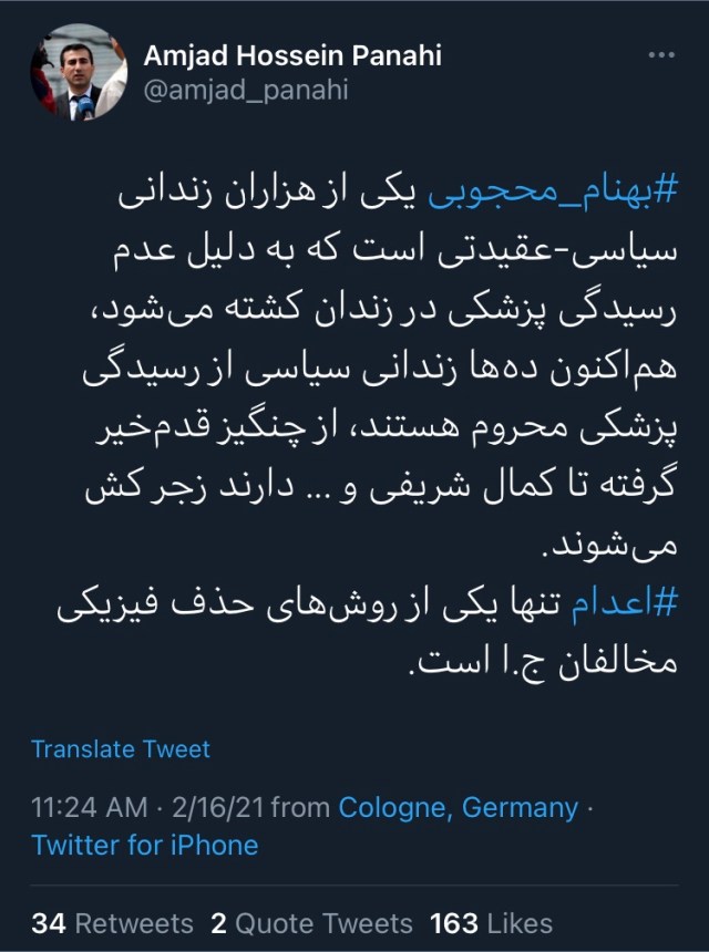 یک فعال حقوق بشر به نام امجد حسینپناهی هم وضعیت پیشآمده برای محجوبی را محدود به این یک مورد ندانست و نوشت: «هماکنون دهها زندانی سیاسی از رسیدگی پزشکی محروم هستند….دارند زجرکش میشوند.»