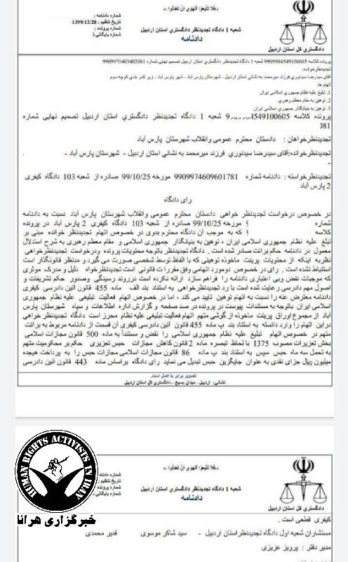 بر اساس این حکم که توسط شعبه ۱ دادگاه تجدیدنظر استان اردبیل به مستشاری سیدشاکر موسوی و قدیر محمدی در تاریخ ۲۸ اسفندماه ۹۹ صادر و اخیرا به وی ابلاغ شده است، رضا سیدنوری از بابت اتهام “تبلیغ علیه نظام” به پرداخت ۱ میلیون و ۸۰۰ هزار تومان جزای نقدی بدل از ۳ ماه حبس تعزیری محکوم شده است.