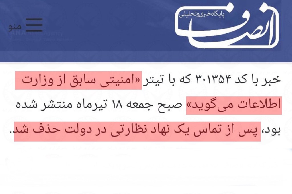 امروز جمعه ۱۸ تیرماه، سایت خبری انصافنیوز نوشته که پس از تماس “یک نهاد نظارتی در دولت” مجبور به حذف گزارش مصاحبه با یک «کارمند سابق وزارت اطلاعات» شده است.