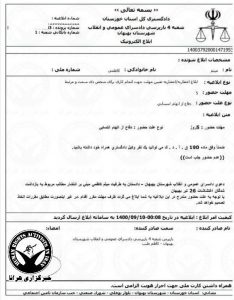 دلیل احضار این شهروند در ابلاغیه صادره “انتشار مطالب مربوط به بازداشتشدگان «اغتشاشات» ۲۶ تیر بهبهان” عنوان شده است.