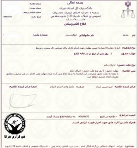 بر اساس ابلاغیهای که در تاریخ ۲۳ آذرماه ۱۴۰۰ توسط شعبه ۱ واحد اجرای احکام دادسرای اوین به ریاست امیرحسین تاریان صادر و به این شهروند ابلاغ شده است، از آقای ابوالحسنی خواسته شده تا ظرف مدت ۵ روز از زمان درج ابلاغیه در سامانه الکترونیکی ثنا در این شعبه حاضر شود.